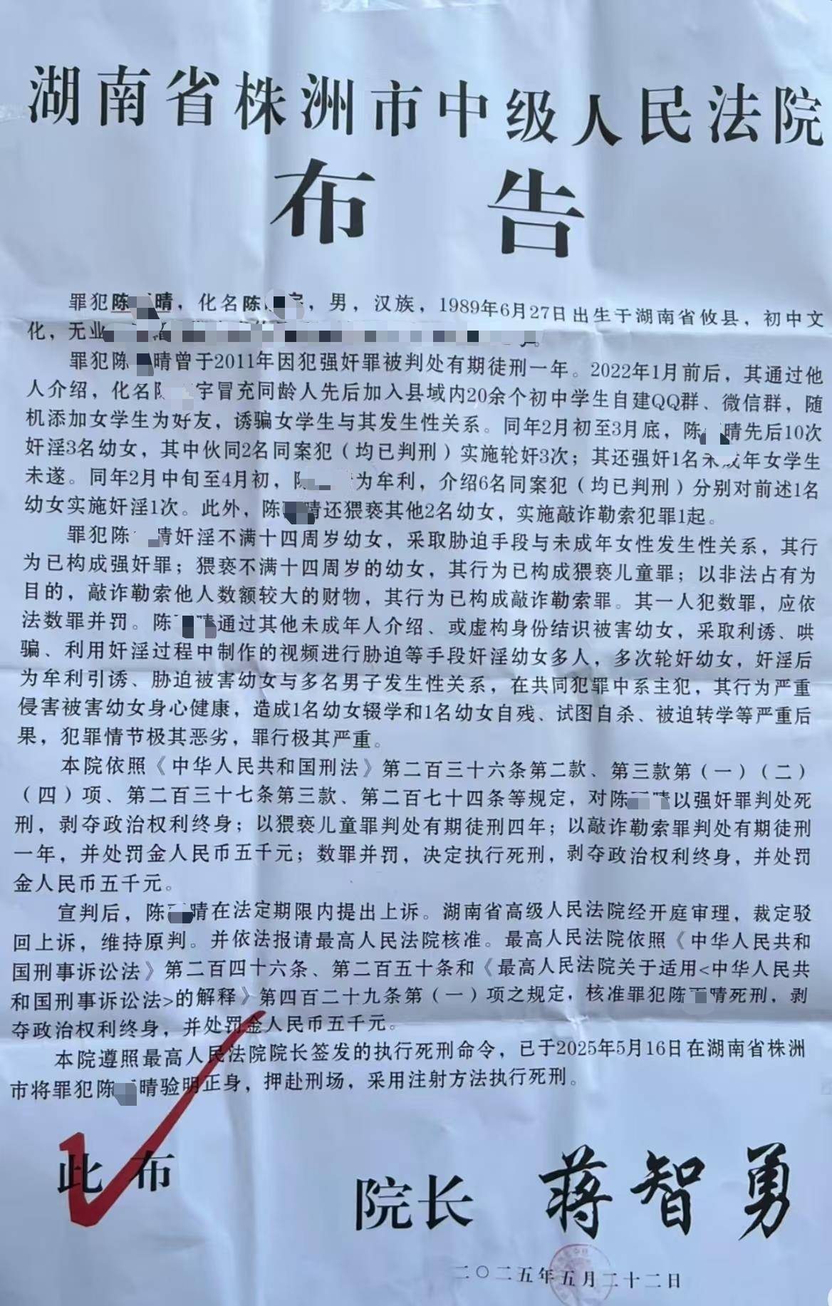 近日,极目新闻记者在湘潭市中级人民法院门口的布告栏看到一则张贴的株洲市中级人民法院布告。布告显示,湖南株洲攸县一男子假扮初中生,诱骗女学生和他发生性关系,先后多次强奸、轮奸多名幼女,还介绍同案犯强奸幼女,用视频胁迫对方,造成女生自残、被迫转学等。2025年5月16日,该男子被押赴刑场,采用注射方法执行死刑。