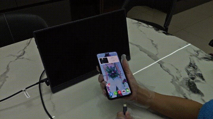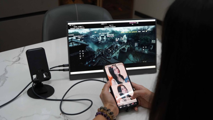又或者咱们就净连着手机,然后拿着便携屏追剧比拿手机看爽多了,这样手机能回微信,刷抖音,又能追剧,还能给手机充电。