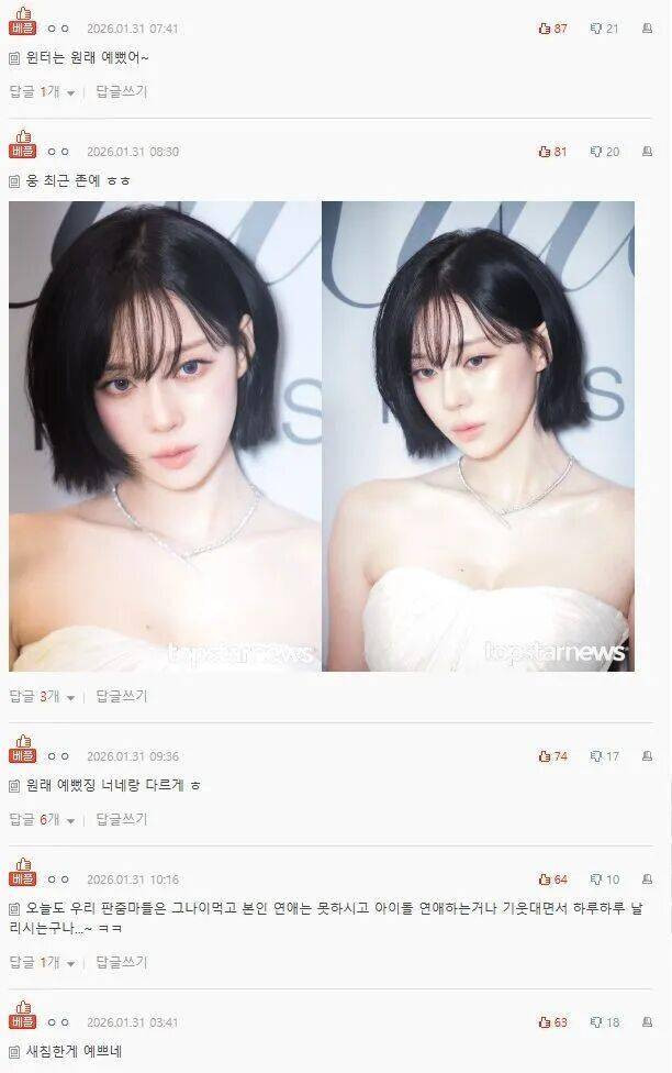这一时间线确实巧合。就在恋爱传闻闹得沸沸扬扬之际,Winter果断剪去了长发,回归了类似出道初期的经典波波头造型。随后,韩国知名网络社区Pann上一篇热帖便直接点明:“自从Winter恋爱后,她变得更美了。” 这一说法迅速将“颜值蜕变”与“恋情状态”捆绑,推上了舆论风口。